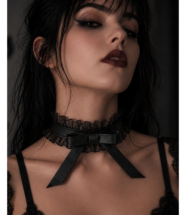 This gothic choker blends soft lace detail with structured leather choker design. Featuring a sheer ruffle trim and a bold bow front, it creates a clean contrast between delicate and edgy styling.