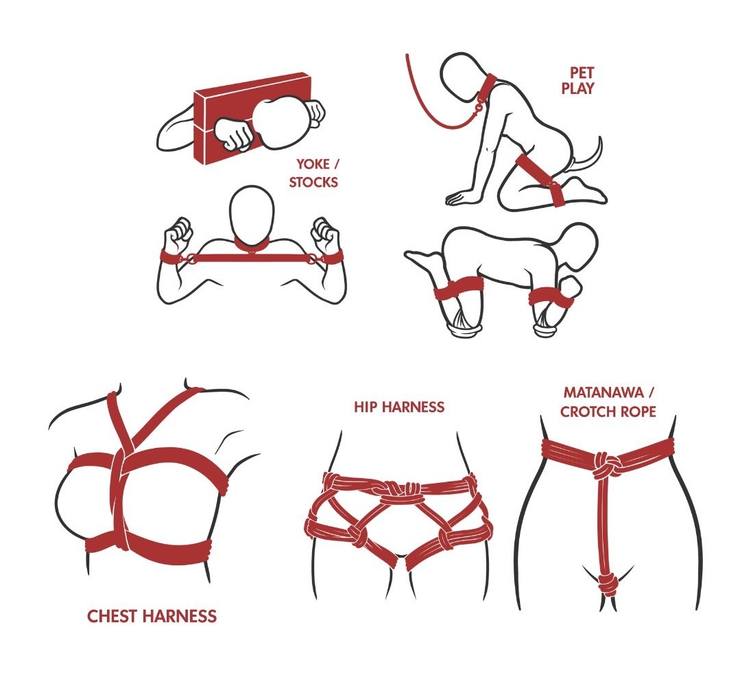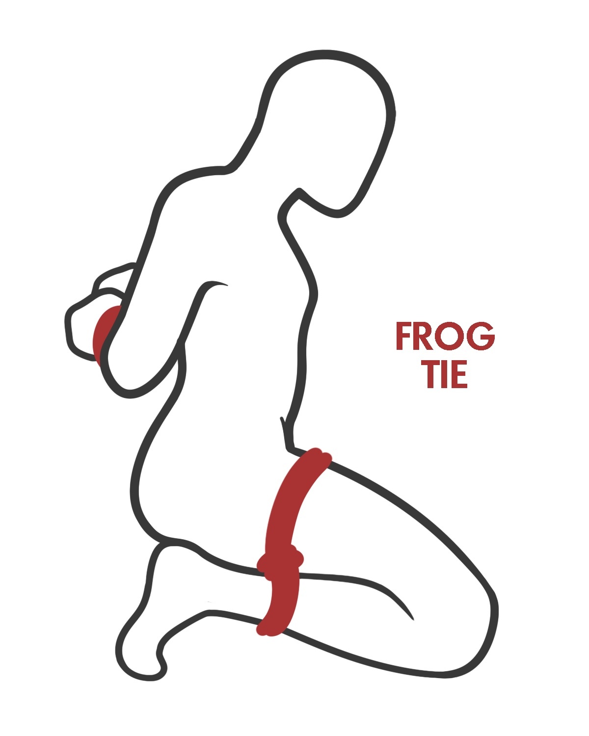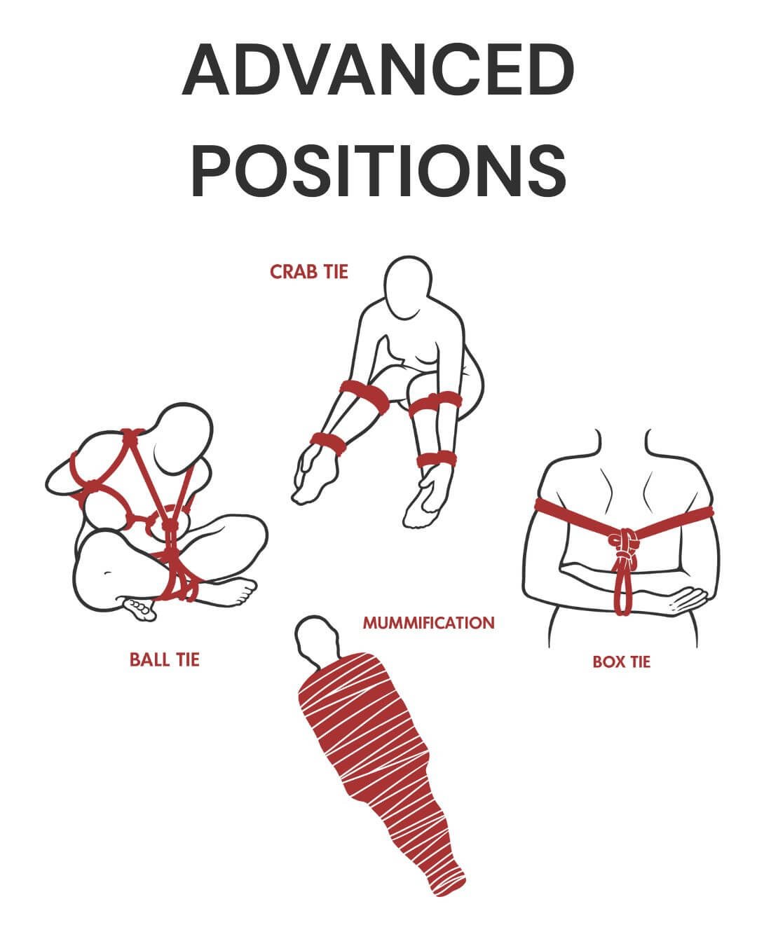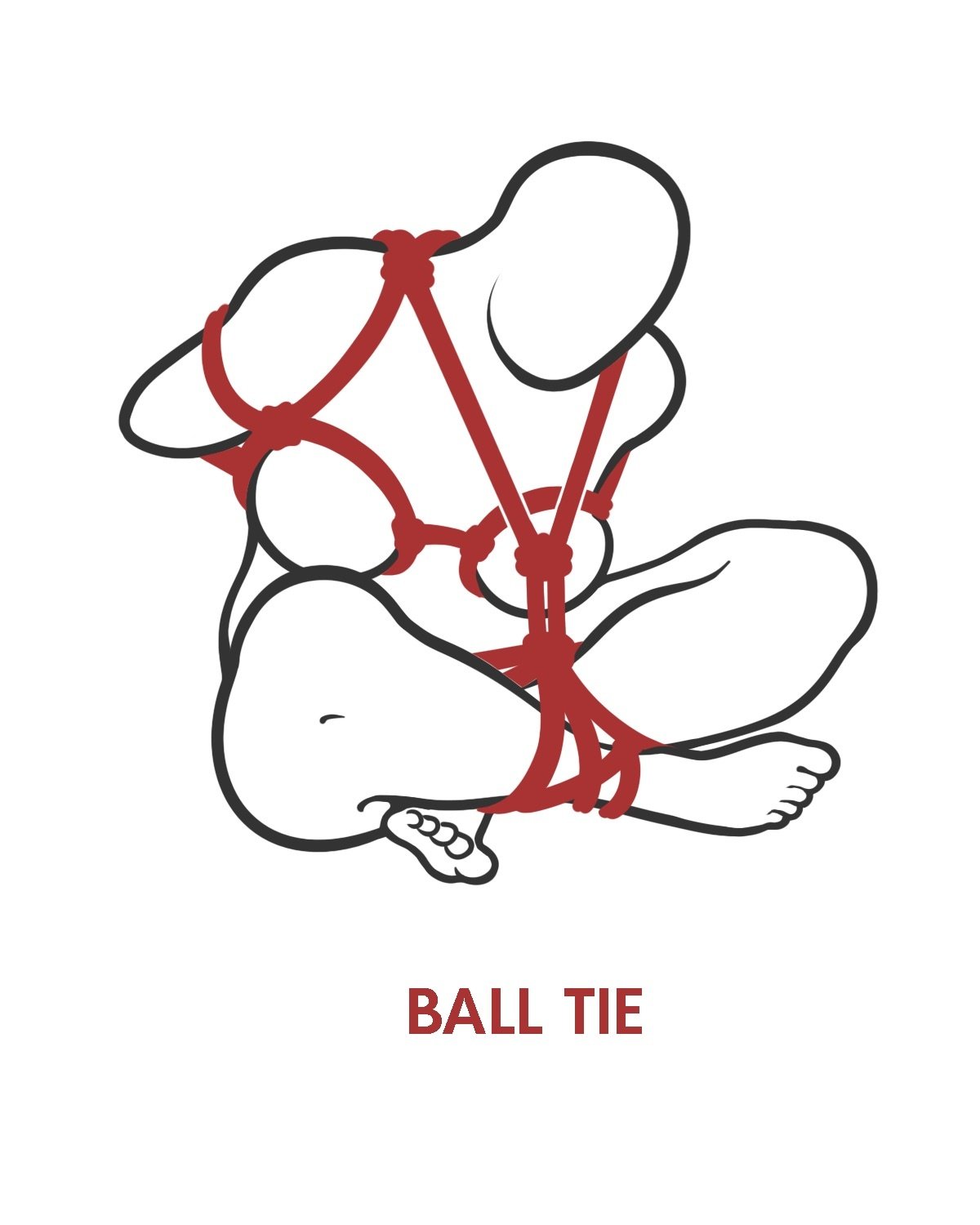 Just as the name implies, ball ties are designed to force the sub’s chest close to their legs to resemble a ball. There are plenty of variations, with some versions requiring the sub to sit with their chest pressed against their criss-crossed legs. Others bind the sub’s legs so their knees are against their chest in a fetal position. Many variations also restrain their arms behind their back. The ball tie is considered advanced, as it’s more complex to tie and requires more flexibility.