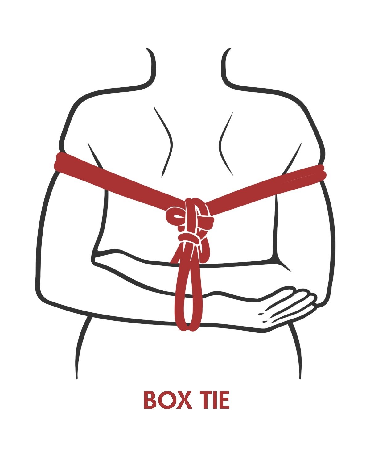 Many of the other positions we’ve mentioned in this blog include restraining someone’s arms behind their back, and the box tie is a great option for those interested in using rope. You may have already guessed it, but this tie can be done in many ways, but most variations restrain the sub’s arms behind their back with elbows bent and forearms bound together. Box ties can range from single column and row ties (as shown in the diagram above) to more complex patterns with multiple cross sections. If you’re still new to rope bondage, start off with simpler versions and work your way up.
