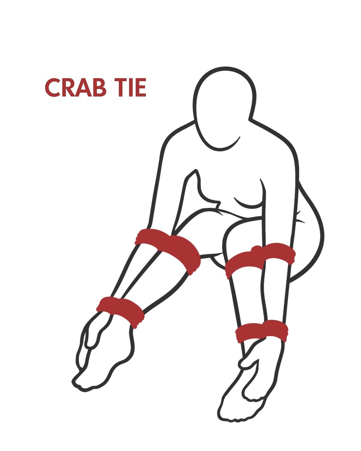In the crab tie, the sub’s arms and legs are bound together in a bent, folded posture that resembles the shape of a crab. The wrists and ankles are secured closely to the body – sometimes behind the back, sometimes in front – so the body curls tightly while leaving the legs open and vulnerable for plenty of types of play and torture. In and of itself, this position is great for floor play but can also be modified for suspension. Like plenty of other rope bondage restraints, this tie plays nicely with other ties (like chest harnesses) to add more layers of restriction.