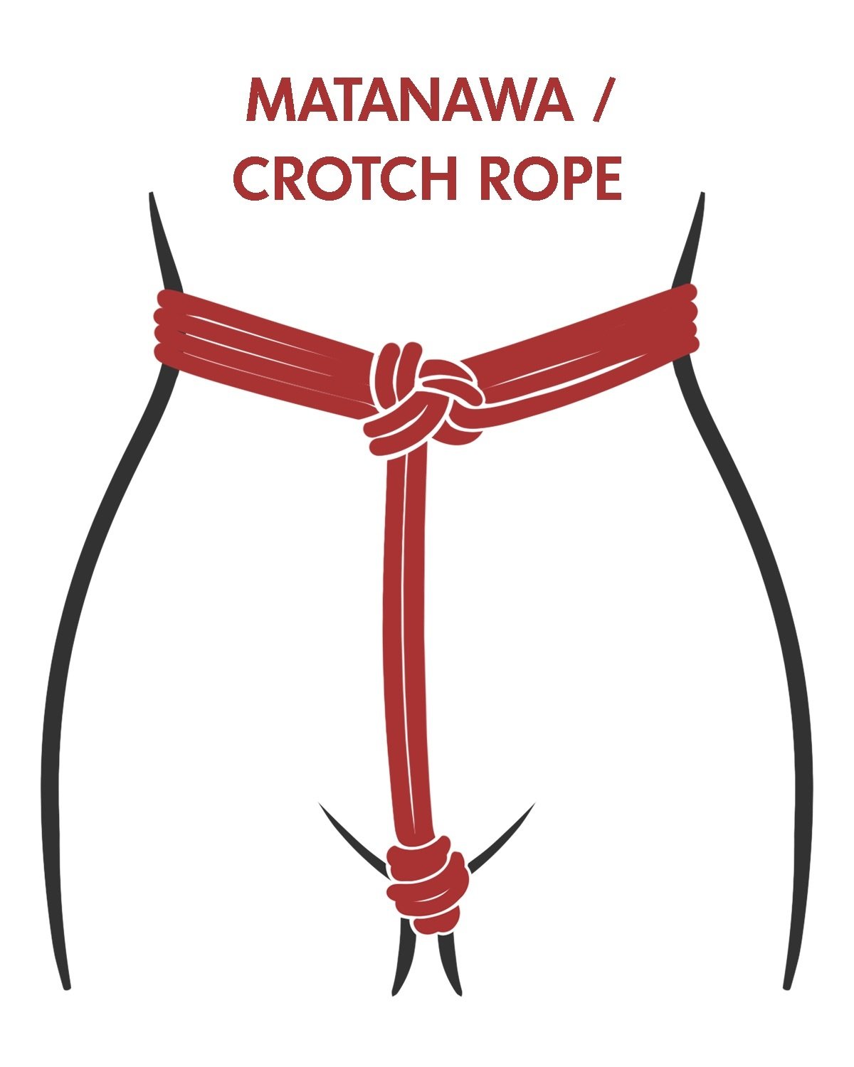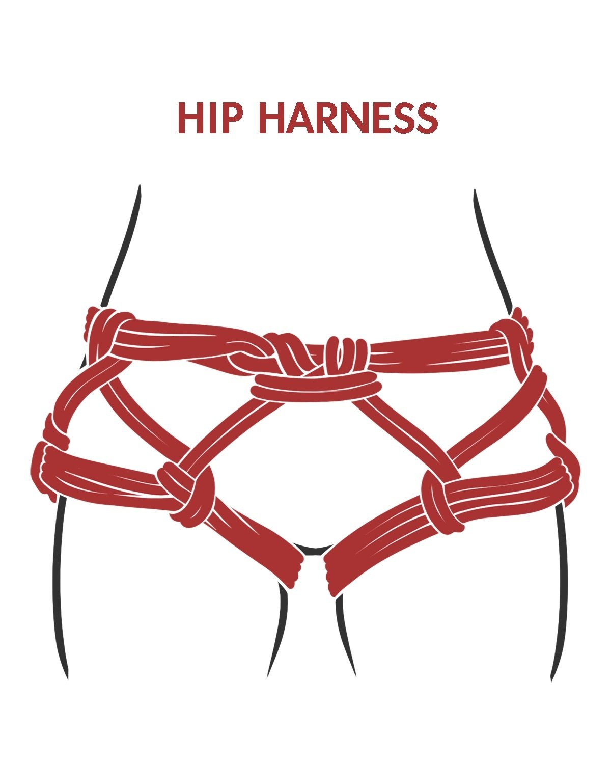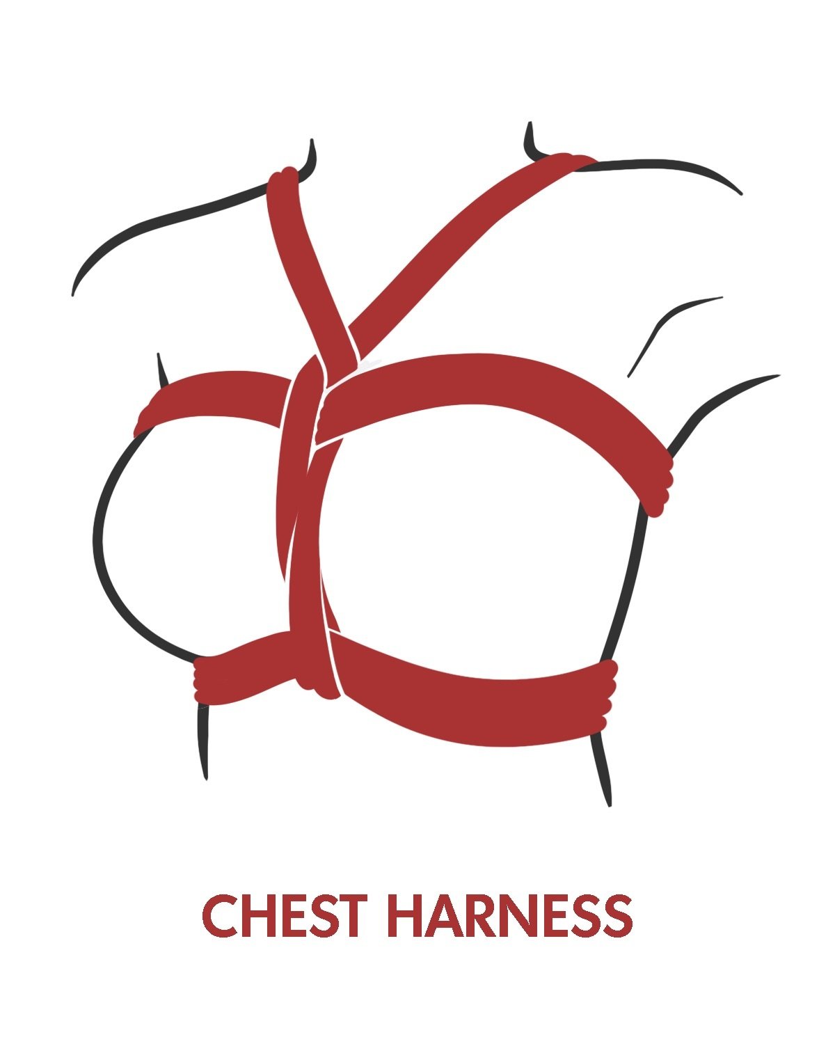 There are plenty of rope chest harnesses, the most popular being the Bikini and Shinju harnesses. Chest harnesses frame the torso and breasts quite nicely, making them popular accessories. Both of these harnesses are also buildable, serving as an easy connecting point for wrist and arm ties. Our diagram is of the Bikini Chest Harness, which cannot be used for suspension, while the Shinju Chest Harness can be used as the foundational upper-body attachment for suspension.