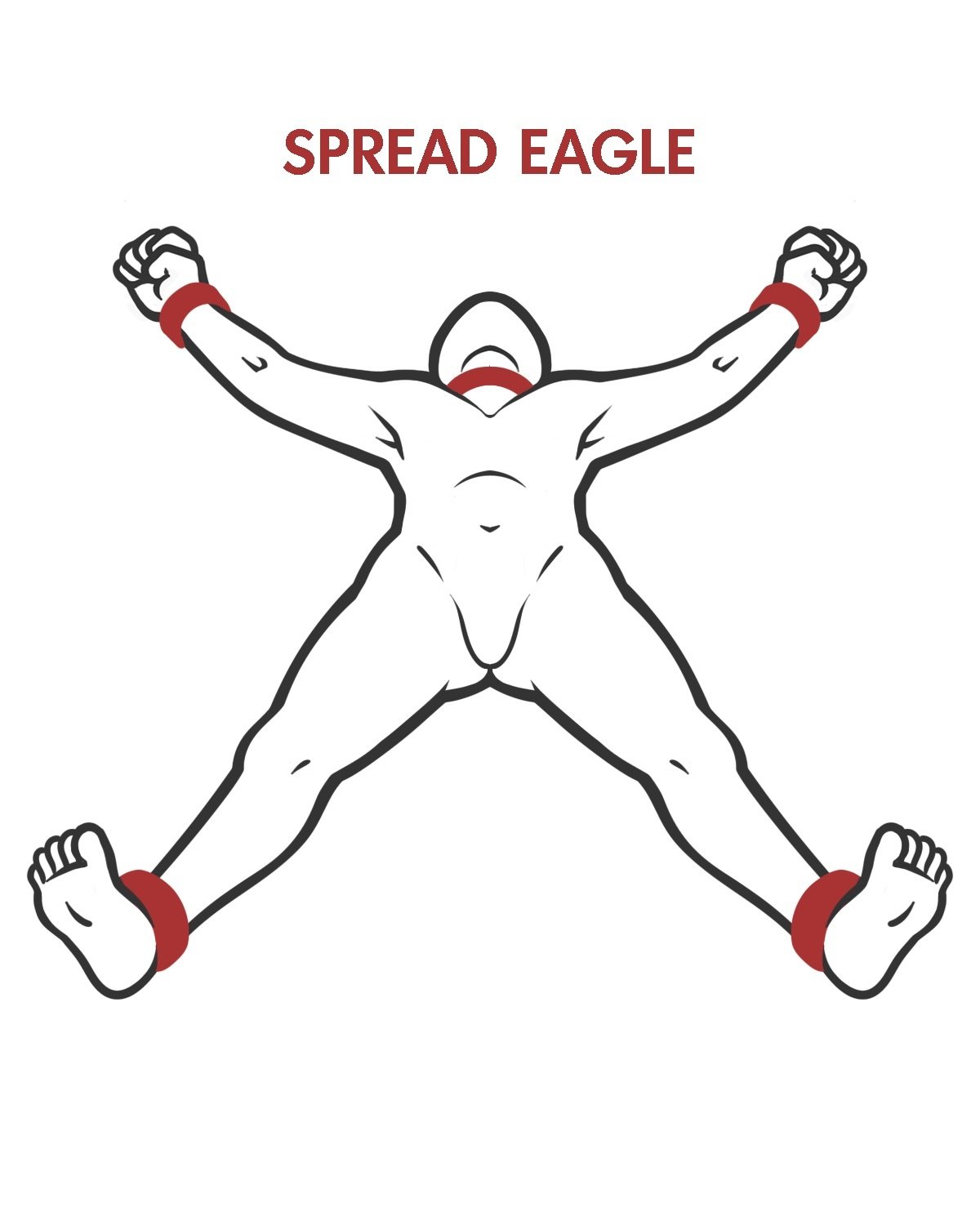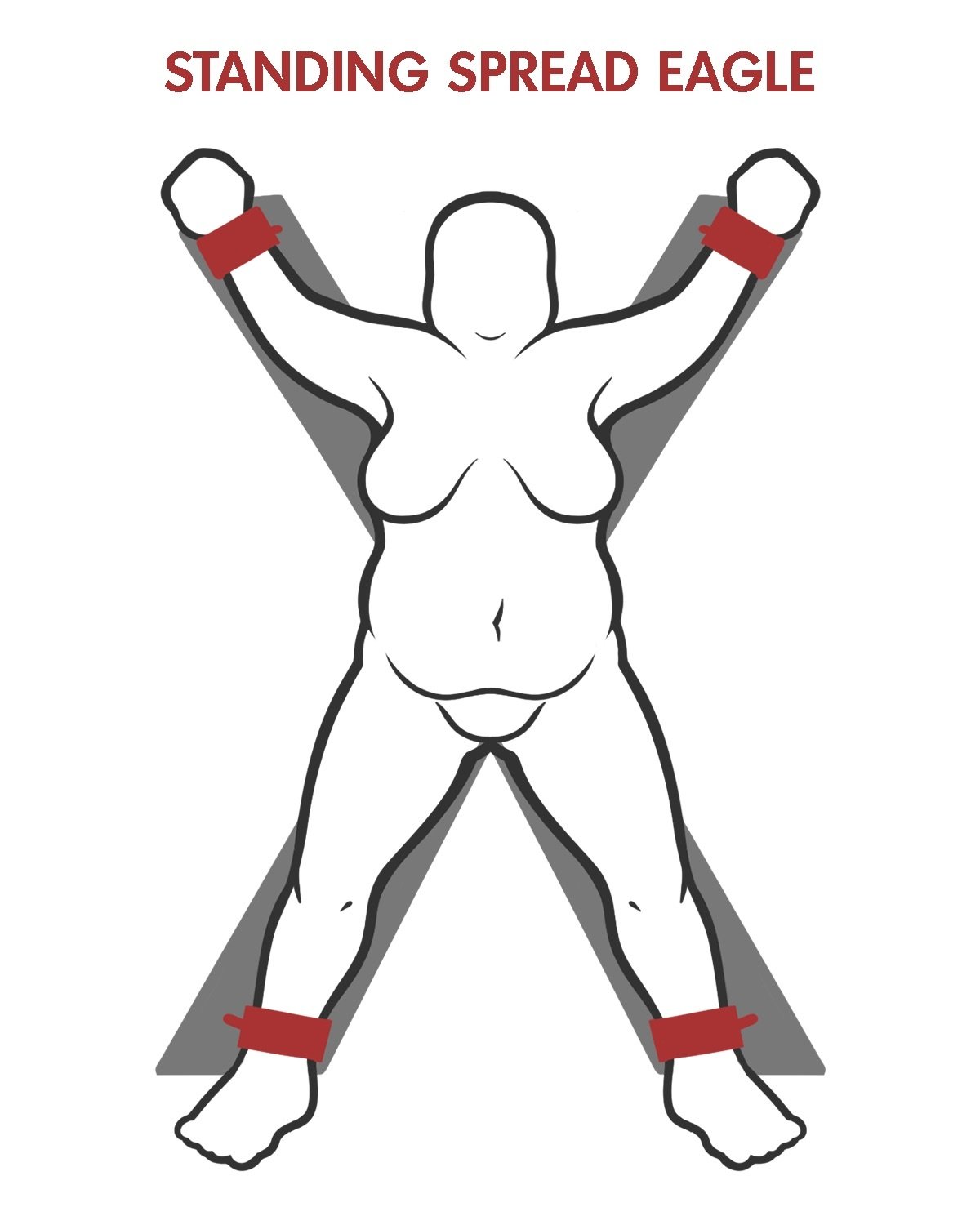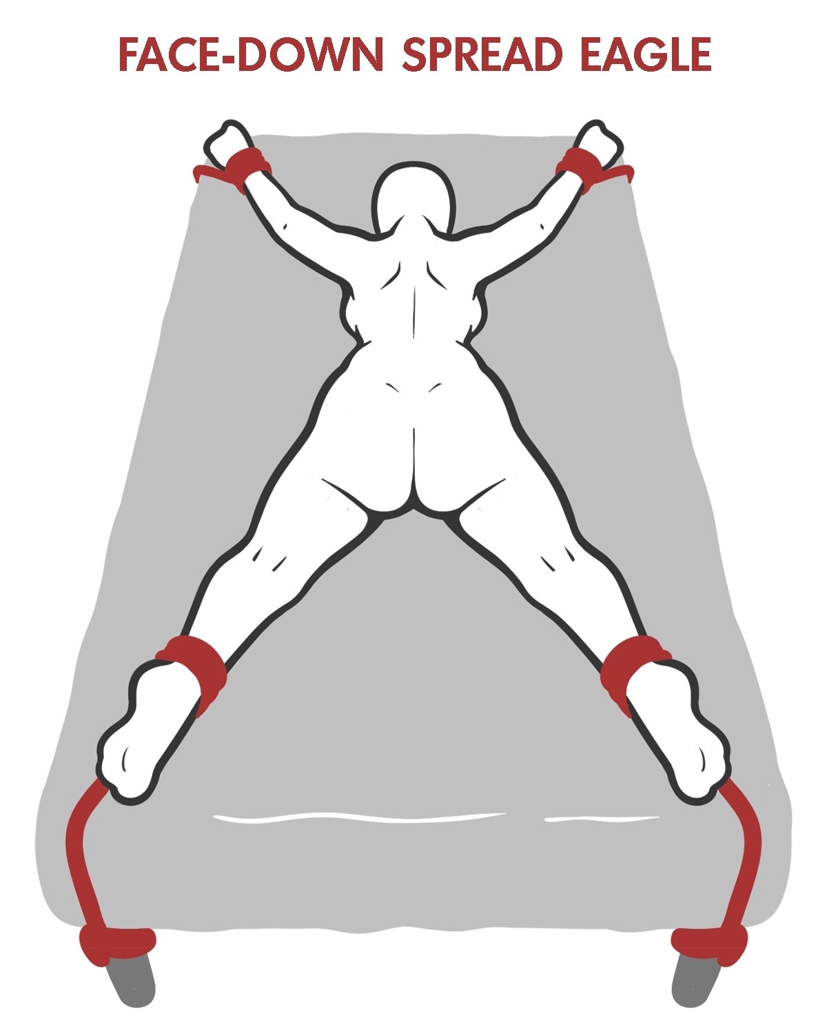 Similar to the classic Spread Eagle position we mentioned in the Basic Positions section, this position has the sub lying on a bed but this time on their stomach. What takes this position up a notch is how it adds more discomfort for the sub. Because they are face-down, they may have to experiment with how they tense their body or position their head to breathe, adding in some humiliation into the mix of the experience. And, of course, their completely exposed backside makes for a great impact and/or torture scene.