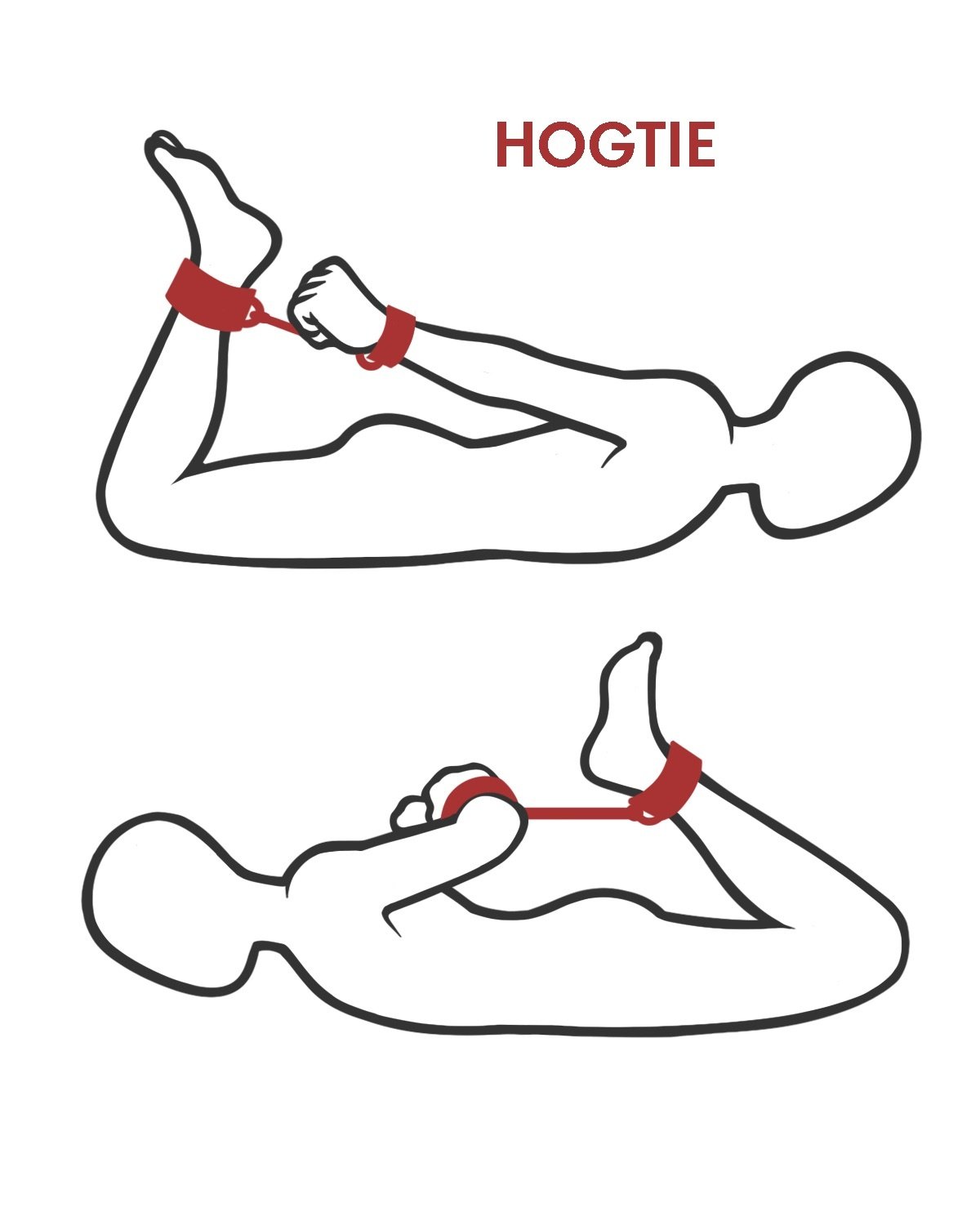 Hogties also restrain the wrists to the ankles but with more flair by keeping the sub’s legs raised behind them. Most commonly, the sub lies on their stomach with their wrists restrained to their ankles with a connector, chain, or rope to put more distance between them. This gap allows the weight and angle of their legs and arms to determine how the position stretches them. To limit the sub’s ability to lie fully on their chest, bind the forearms to the ankles instead of the wrists and/or shorten the length of what’s connecting them.