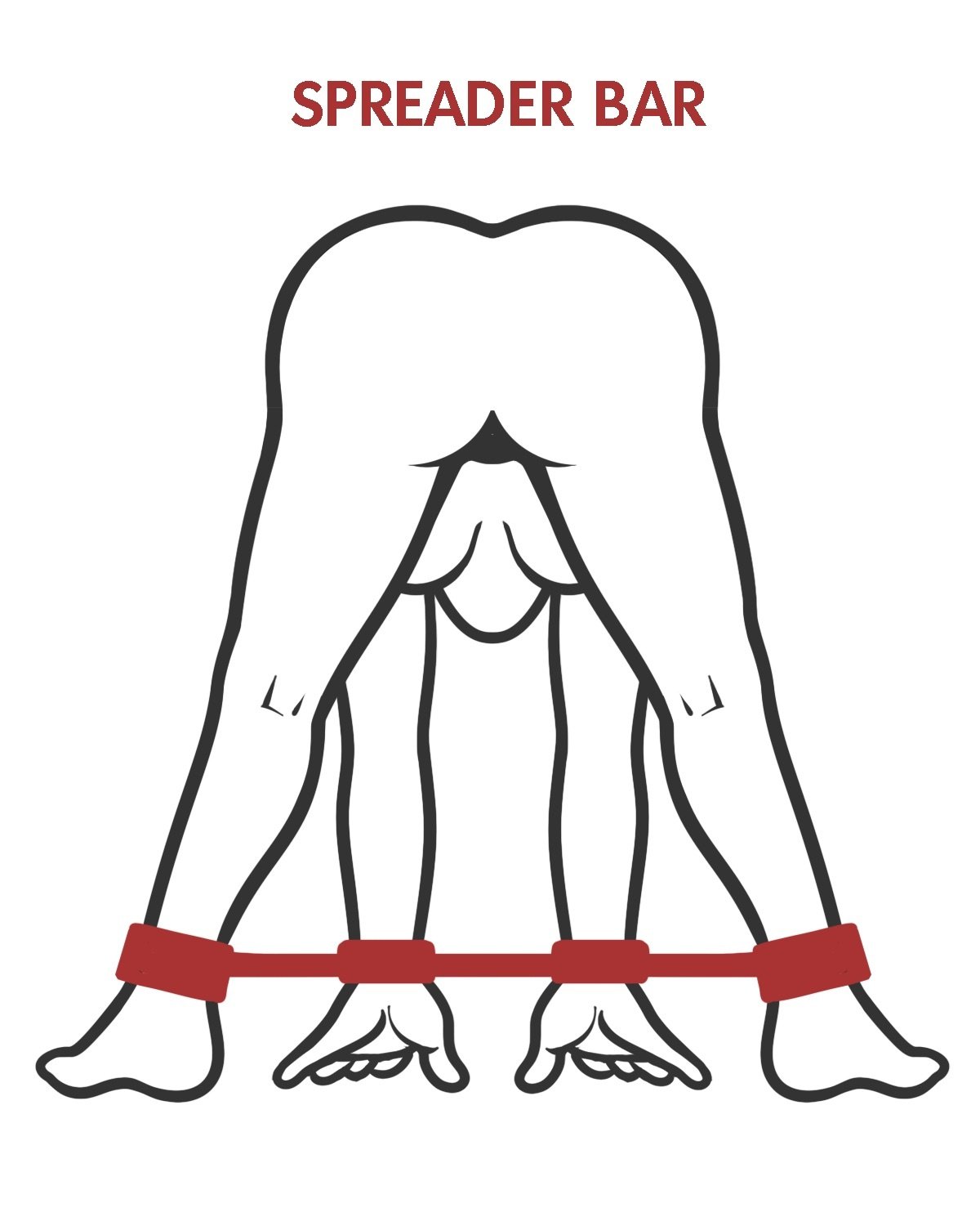 One of the appealing features of the spreader bar is how quickly and easily someone can be restrained and forced into a vulnerable position. The most popular way to use a bar is to keep the legs apart by clipping in ankle cuffs at each end, but there’s plenty of ways to add onto that. As seen in the diagram, a spreader bar can force more flexible submissives on all fours, keeping the rear and everything in between fully available. For less flexible subs, try lying on the back instead.