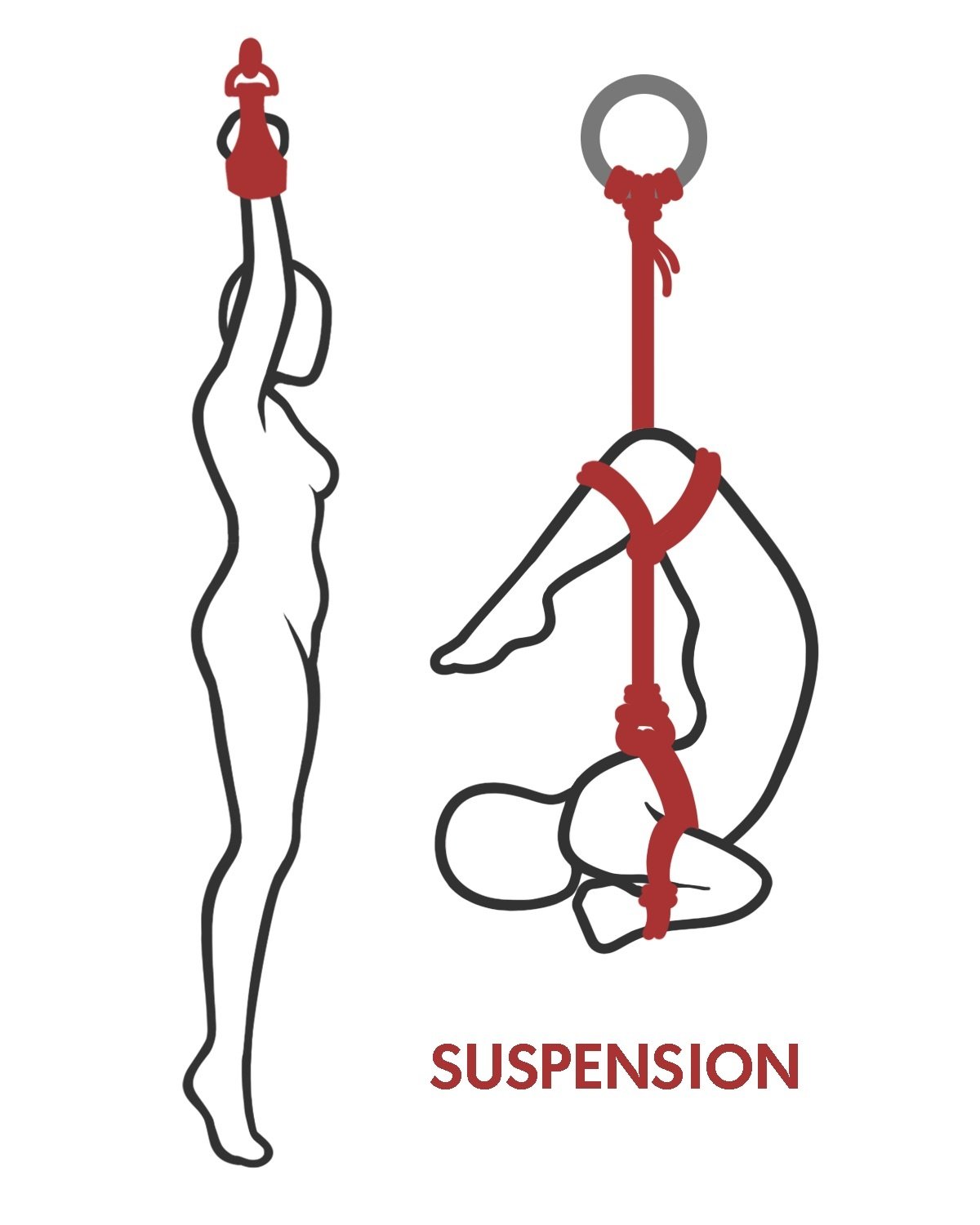 Suspension positions elevate some or all of the body, and they can range in complexity. Suspension cuffs and rope are the most popular restraints used with suspension rings or spreader bars and anchor points open the doors for plenty of exploratory play. Suspension cuffs make it quick and easy to get someone off the ground, while using rope suspension techniques requires research, practice, and patience – read more about some of the basic suspension rope ties in the upcoming section. Regardless of whether you’re using cuffs or rope, suspension definitely takes bondage play up a notch and comes with more risk. If you’re using rope, always have a pair of safety shears handy. Check out our favorite rope bondage book filled with plenty of step-by-step instructions on a huge variety of knots, Foundations of Rope Bondage by TheDuchy.