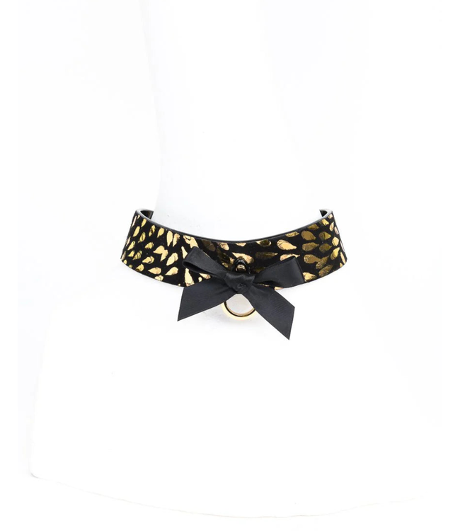 Made from gold foil embossed black suede and black patent leather, the collar exudes richness and texture. 24K gold plated rivets and trimmings provide a sparkling, couture edge, while a delicate satin bow accent adds a playful and flirty touch. A large lobster clasp closure ensures a secure and polished fit, making this piece as practical as it is statement-making.