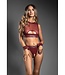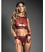This three piece set includes a burgundy sheer mesh and faux leather peekaboo top and a faux leather ouvert panty, both of which feature gold O-ring hardware. The matching vegan leather cuffs can clasp to each other or to either of the O-rings for restraint play.