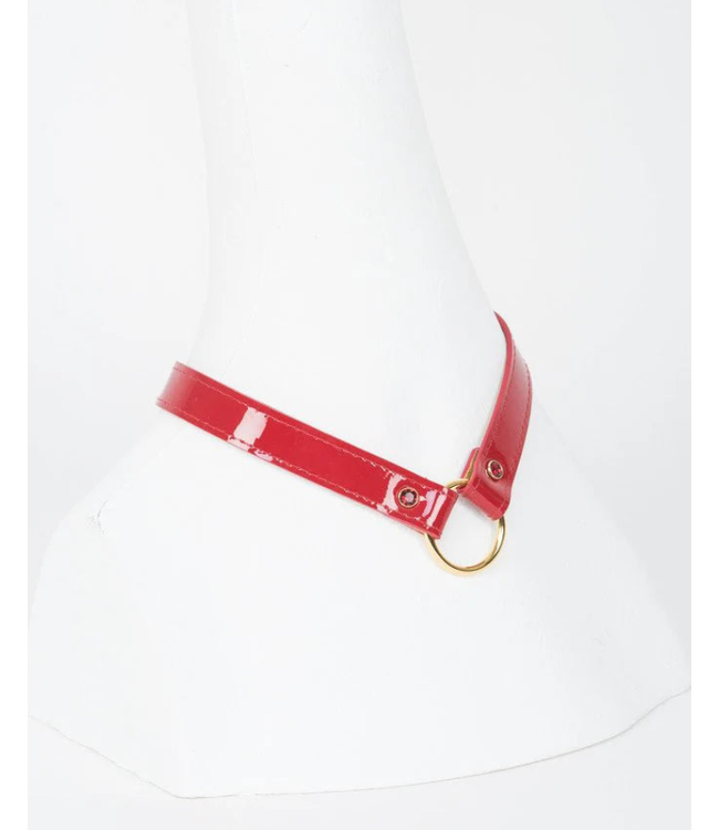 Handmade to order in Berlin, the Red Hot Collar features shiny red patent leather, luxuriously lined with metallic gold leather for a rich contrast against the skin. Swarovski® Red Siam crystal rivets, set in gold-rimmed mounts, shimmer with fiery intensity, while 18K gold-plated trims elevate the piece with unmistakable opulence. Finished with an embossed Fräulein Kink logo, every detail speaks to bold confidence and couture fetish design.