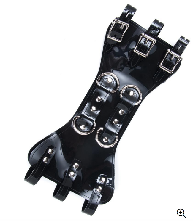 The size adjusts with three lockable buckles on each side. There are four D-rings attached to the front and the back, which can serve as points of attachment for rope/cuffs/etc., creating many bondage possibilities.
