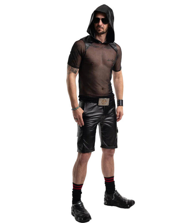 his men’s hooded T-shirt is designed for those who embrace expressive style with a fetish-inspired edge. Crafted from ultra-soft, highly elastic transparent mesh, the fabric gently contours to the body while subtly revealing musculature, tattoos, or piercings for a striking yet refined effect.