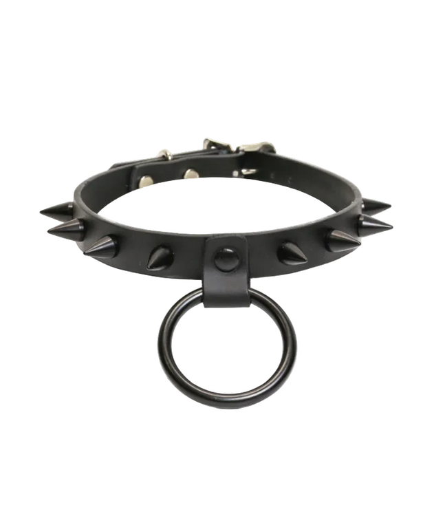 This spiked O-ring choker delivers a clean, bold look with strong BDSM and gothic influence. Made from durable leather, it features sharp cone spikes and a centered O-ring that adds both visual impact and function.
