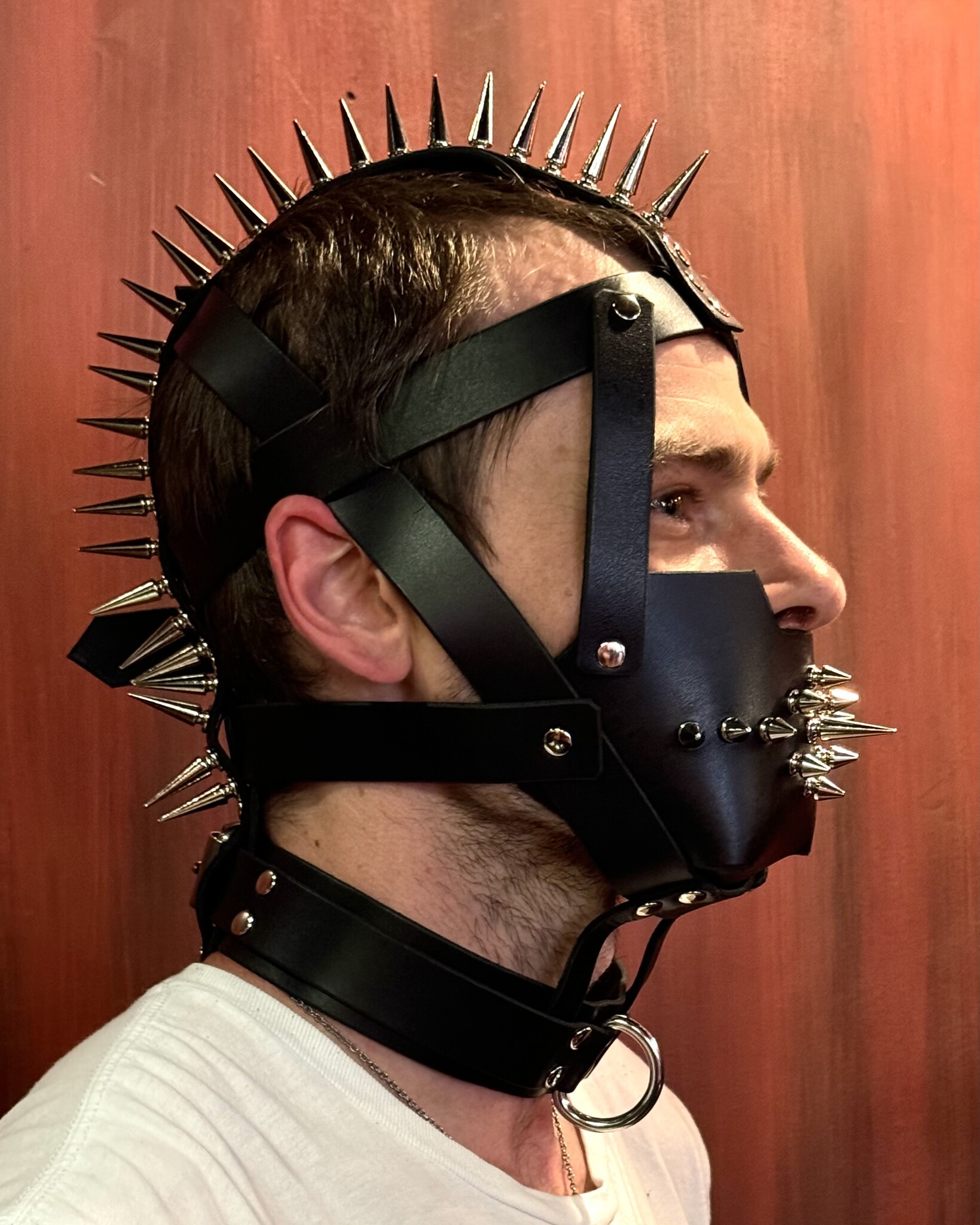 Make a statement with this intimidating bondage hood! This bondage hood is the meeting of form and function. Multiple adjustable straps make for a precise fit, with steel hardware, copious spikes and premium latigo leather create a punk BDSM piece of gear.