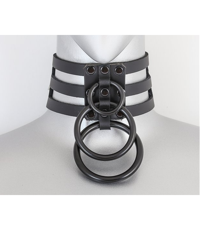 The Triple Ring Choker is a striking play and fashion collar designed to command attention. Featuring three layered metal rings at the front, this collar combines visual impact with functional restraint styling. The wide 1.75" band provides a supportive feel around the neck, while the nickel-plated steel hardware adds durability and a sleek, industrial aesthetic.