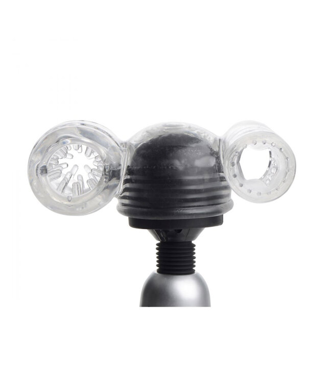 Transform your favorite massage wand into a male sex toy with an accessory that gives you two ways to play. This attachment slips easily over the head of a standard-sized wand vibrator, providing two textured strokers.